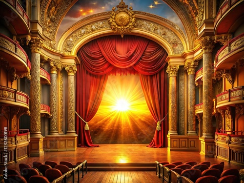 © Sandra, Obraz premium Red velvet curtain, spotlight highlights theatrical scene.