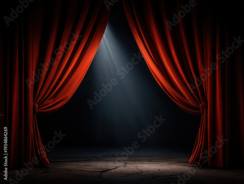 Fototapeta premium Red velvet stage curtain slightly opened revealing dark empty stage lit by single dramatic spotlight creating moody theatrical atmosphere