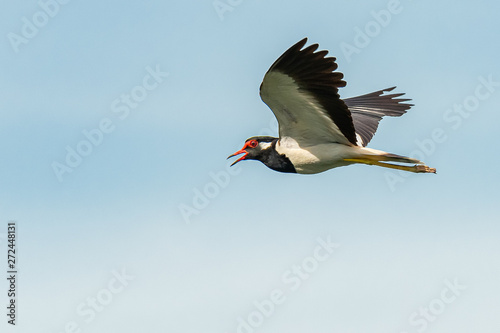 © phichak, Fototapeta premium Red-Wattled Lapwing in flight with blue sky background