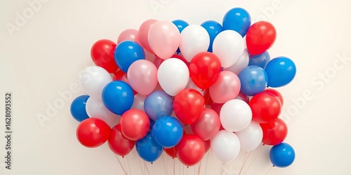 Obraz premium Red, white, and blue balloons clustered on a white wall, red, photography