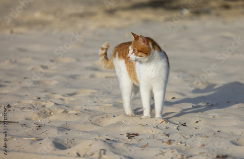 © lom742, Fototapeta premium red-white cat walks along the sand close-up