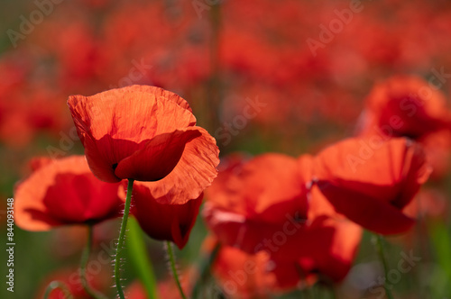 Obraz premium Red wild poppies growing in a poppy field. The sun shines through the petals....