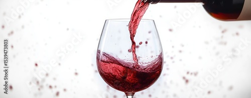 Fototapeta premium Red wine being poured into a clear glass with splashes and droplets captured...