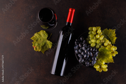 © evgeeenius, Fototapeta premium Red wine bottle and fresh grapes