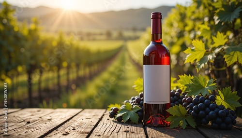 Fototapeta premium Red Wine Bottle in Vineyard at Sunset, Wine bottle, grapes, vineyard sunset. Relaxing, summer vibes.