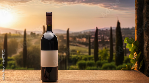 Fototapeta premium Red wine bottle mock up, empty white label, product promotion, advertising, vineyards at sunset