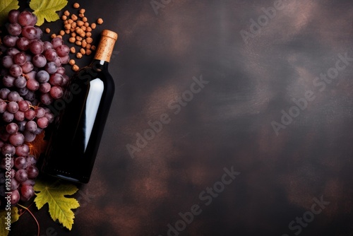 © nsit0108, Naklejka premium Red wine bottle with ripe grapes and nuts on a dark background providing generous copy space