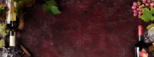 Fototapeta premium Red Wine Bottles and Glass with Grapevine on Rustic Background