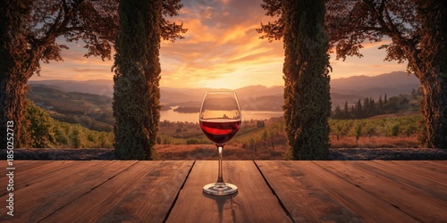© vxnaghiyev, Obraz premium Red wine glass in outdoor setting with scenic landscape, highlighting leisure during seasonal celebrations, World Malaria Day