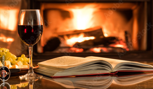 © Rasulov, Naklejka premium Red wine glass with an open book on table in front of burning fireplace.