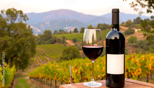 © Chang_Chanvit, Fototapeta premium Red Wine Tasting Scene with Fall Colored Vineyards Background