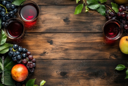 © firdan, Fototapeta premium Red Wine with Grapes and Apple on Wooden Table