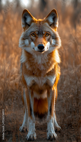© Nadiyah, Fototapeta premium Red wolf sitting in tall grass, looking directly at camera.