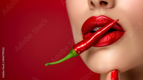 Obraz premium Red woman lips holding hot chili peppe copy space ai generative