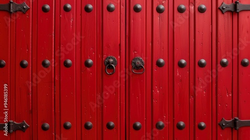 Fototapeta premium Red Wooden Door with Black Metal Knobs and Studs