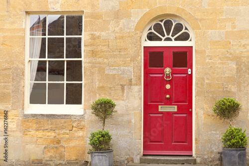 Fototapeta premium Red wooden doors in an old traditional English stone cottage with two plant...
