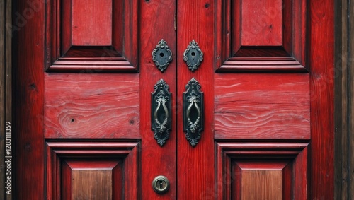 Fototapeta premium Red wooden double door with intricate black metal handles and keyhole,...