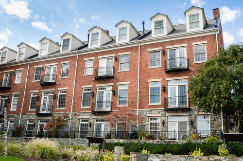 © alpegor, Fototapeta premium Red Wooden Front Door and a White Window with Black Shutters on an American Colonial House along a Brick Sidewalk. Alexandria, VA