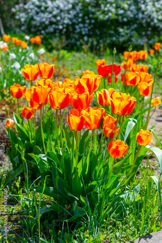 Fototapeta premium Red-yellow tulips blooming in spring in the garden, botanical garden