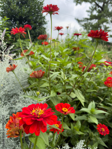 © Cavan, Obraz premium Red Zinnias in a botanical garden.