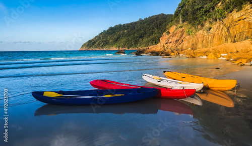 © Johnseanphotography, Obraz premium Redang Island, Malaysia Colourful Kayak boats on the beach ready to be sailed early in the morning