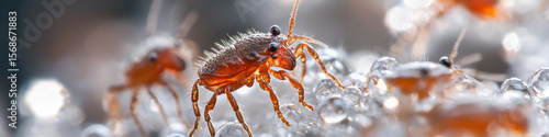 Obraz premium Reddish-Brown Insects on Dew-Covered Surface