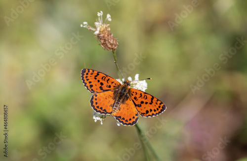 © kenan, Fototapeta premium reddish medium-sized butterfly with black spots, Melitaea didyma