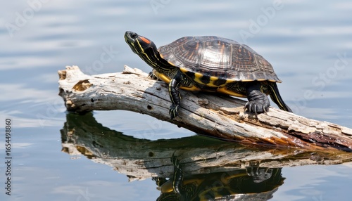 Fototapeta premium Redeared slider turtle basking on a log in a pond, enjoying the warm sunlight and reflecting in water