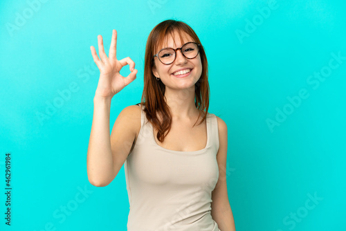 Fototapeta premium Redhead girl isolated on blue background showing ok sign with fingers