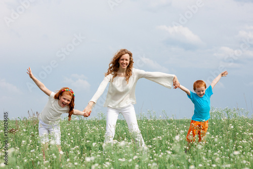 Fototapeta premium Redhead kids having fun with mom in green grass on background of blue sky