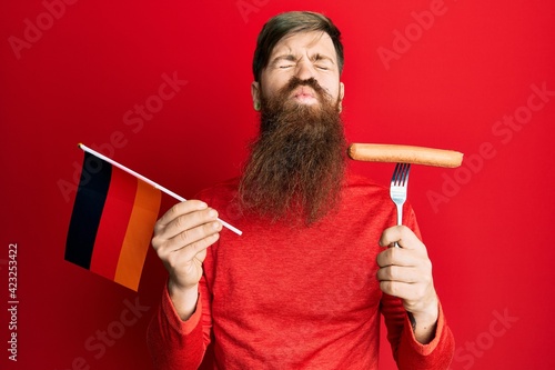 Fototapeta premium Redhead man with long beard holding fork with pork sausage and germany flag...