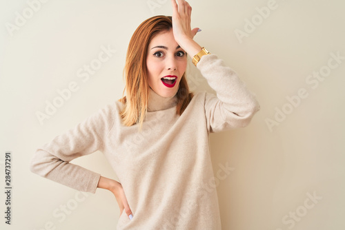 © Krakenimages.com, Fototapeta premium Redhead woman wearing elegant turtleneck sweater standing over isolated white background surprised with hand on head for mistake, remember error. Forgot, bad memory concept.
