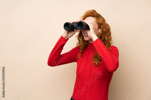 Obraz premium Redhead woman with turtleneck sweater with black binoculars