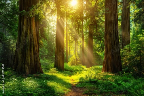 Obraz premium Redwood Forest in Sunlight, Green Pine Trees in Sunlight Rays Falling, Copy Space