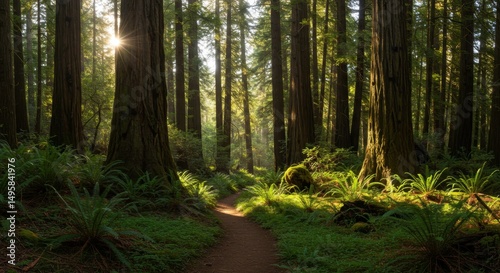Fototapeta premium Redwood forest pathway at dawn