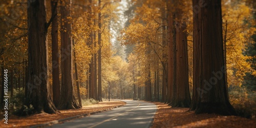 © AkuAku, Obraz premium Redwood trees bordering a city sidewalk, serving as natural shade and landscape feature