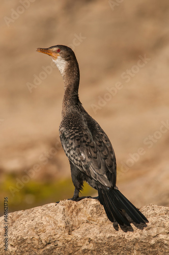 © Petr Šimon, Fototapeta premium Reed cormorant (Phalacrocorax africanus) balances upright on a sunlit rock beside the river. Its glossy dark plumage and red eye gleam in soft afternoon light.