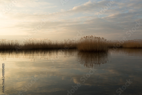 © lindacaldwell, Obraz premium reeds and their reflections on Lake Iznik, Turkey at sunset