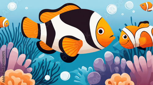 Fototapeta premium Reef Exploration and Underwater Photography. A vibrant underwater scene featuring clownfish swimming among colorful corals and bubbles in a bright blue ocean.