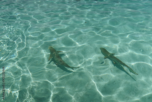 © Leila, Fototapeta premium Reef sharks swimming on island