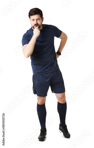 Fototapeta premium Referee in uniform blowing whistle on white background