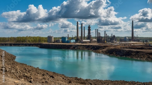 © Cre-AI-Tor , Naklejka premium Refinery by Turquoise Water with Cloudy Sky