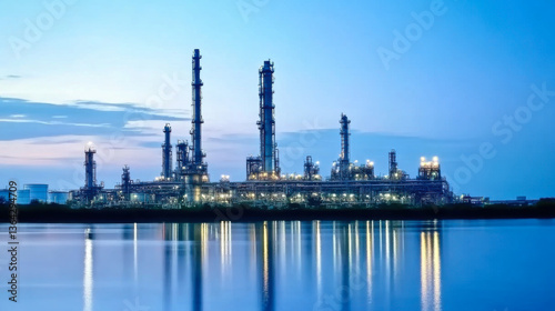 Fototapeta premium Refinery plant area at twilight with river