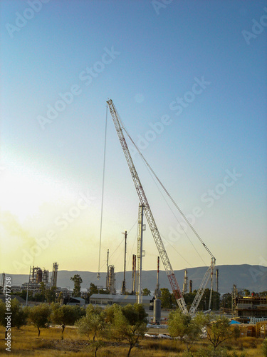 © Serjedi, Fototapeta premium Refinery Under Construction with Heavy Machinery and Building Materials
