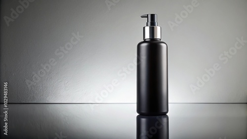 © Songpon, Fototapeta premium Reflected black cosmetic bottle on white surface against grey background
