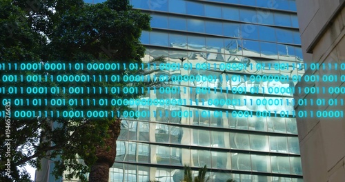 Obraz premium Reflecting glass panels warping pane forms on urban street, with cyan binary overlay and large tree