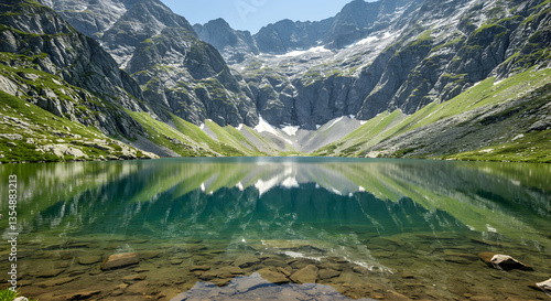 © Nancy, Fototapeta premium Reflecting Lake Scene Surrounded by Rugged Mountain Peaks