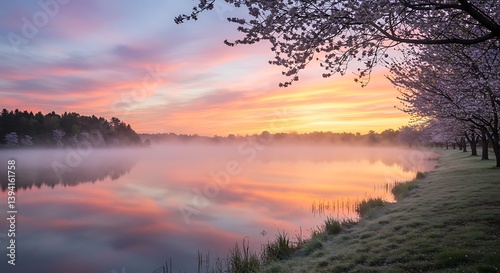 © Day, Fototapeta premium Reflecting Lake with Early Morning Mist and Blossoming Trees Landscape