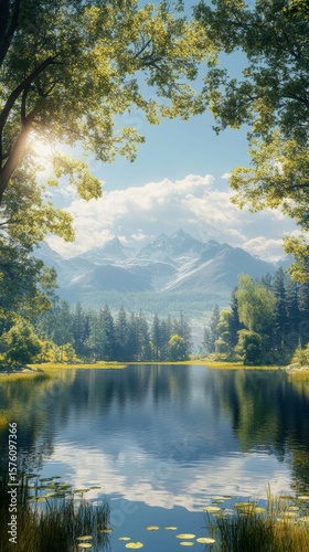 © Optimax Image, Fototapeta premium Reflecting Mountain Lake Surrounded by Forest Scenery
