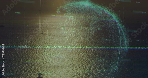 © vectorfusionart, Fototapeta premium Reflecting sunlit ocean surface creating shimmering path at sea, showing waveform and particle arc
